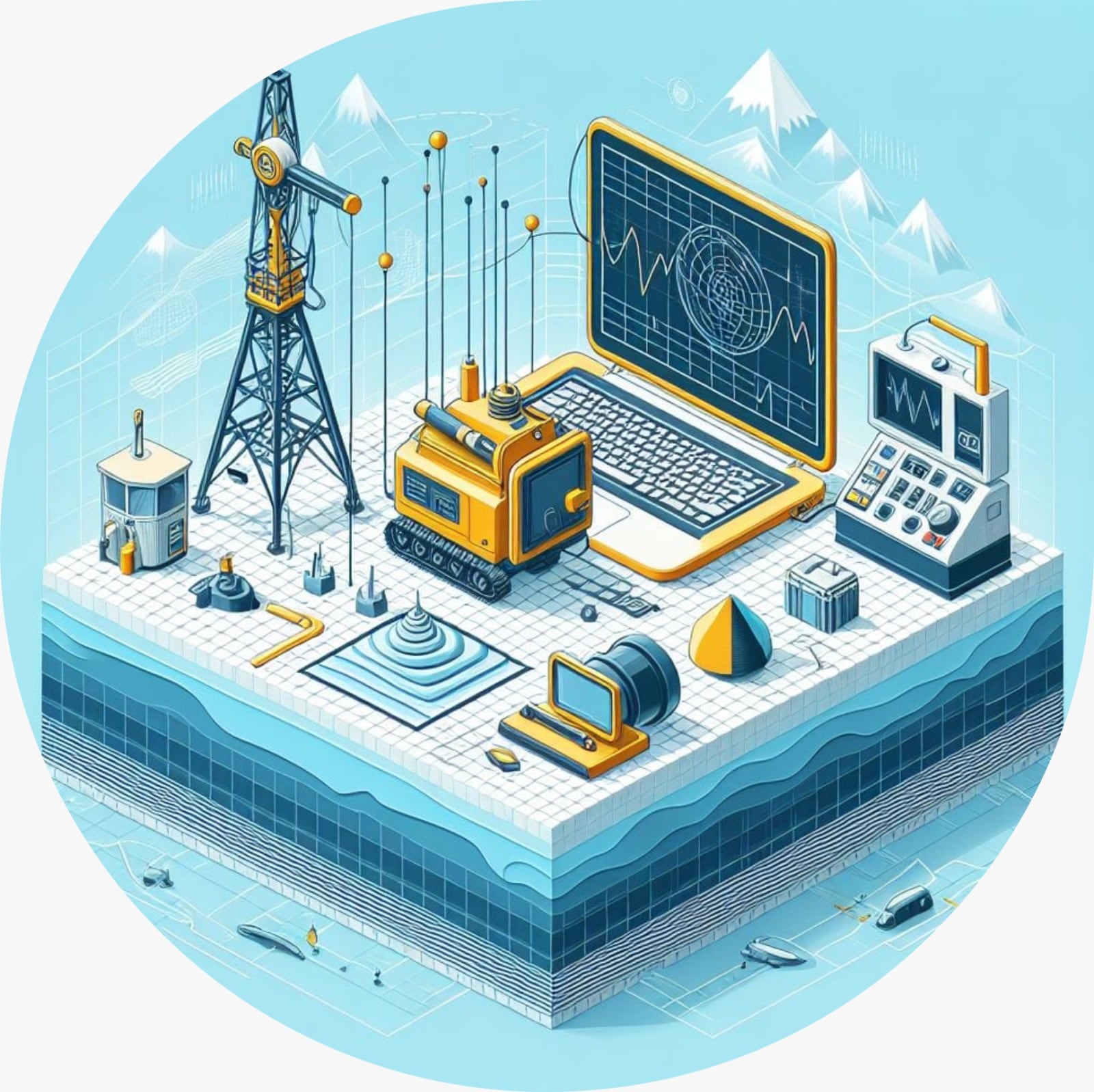 الرادار المخترق للأرض GPR).) المسح الكهرومغناطيسي EM).) مسح المقاومة الكهربائيةER). ) مسح الانكسار الزلزالي (SR) والمسح السيزمي (MASW)، ومسح الانعكاس السيزمي. الدراسات الهيدرولوجية.